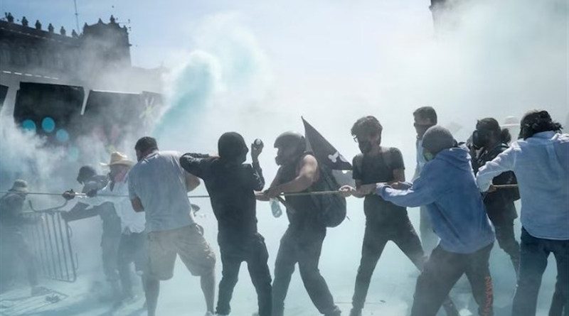 شاهدان در گفتگو با رویترز اظهار کردند در شهر مکزیکو سیتی پایتخت مکزیک، گروه کوچکی از معترضان، نرده های امنیتی دور کاخ ملی را که محل زندگی و استقرار کلودیا شین بائوم رئیس جمهور این کشور است، تخریب کرده و به درگیری با پلیس ضدشورش پرداختند. پلیس برای متفرق کردن معترضان از گاز اشک آور استفاده کرد.