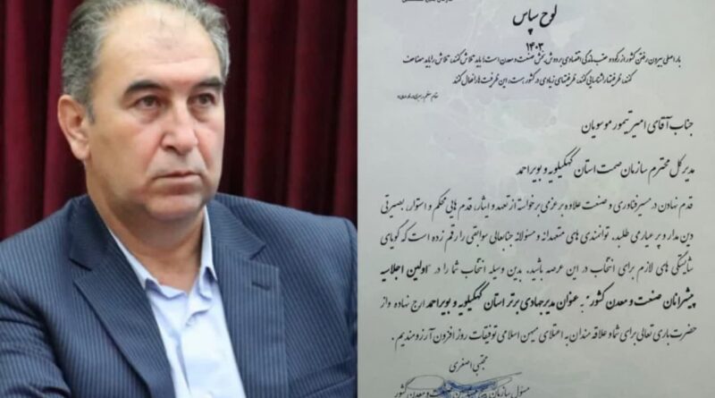 تقدیر از مدیر کل صنعت، معدن و تجارت استان به عنوان مدیر جهادی برتر