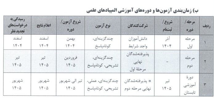 جدول زمانبندی آزمونها و دورههای آموزشی المپیادهای علمی در سال تحصیلی 1404 تا 1405
