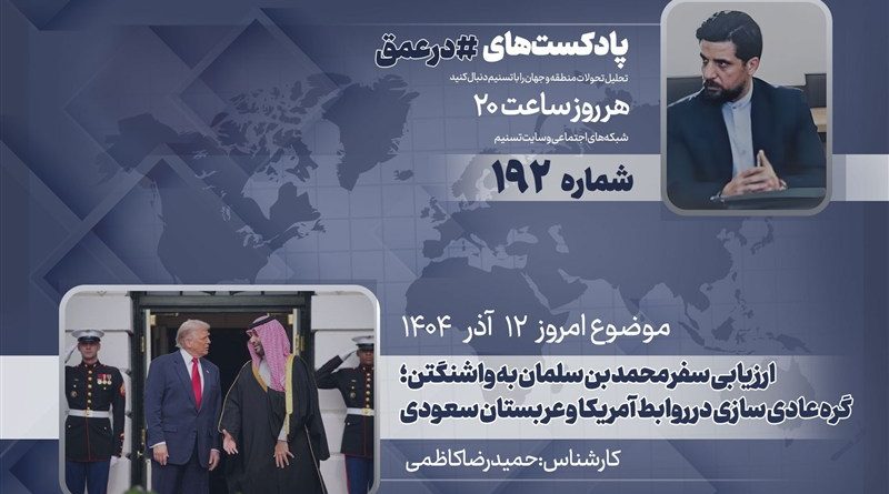 گروه بینالملل خبرگزاری تسنیم ـ یکصدونودمین شماره از پادکست «در عمق» که به بررسی مهمترین روندها، تحولات و همچنین شخصیتها در غرب آسیا میپردازد، روز دوشنبه 10 آذر 1404 ضبط و منتشر شد. در این شماره «حمیدرضا کاظمی»، کارشناس مسائل خلیج همیشگی فارس، به بررسی سفر ولیعهد عربستان سعودی به آمریکا و اثرات این سفر بر مناسبات واشنگتن و ریاض میپردازد.