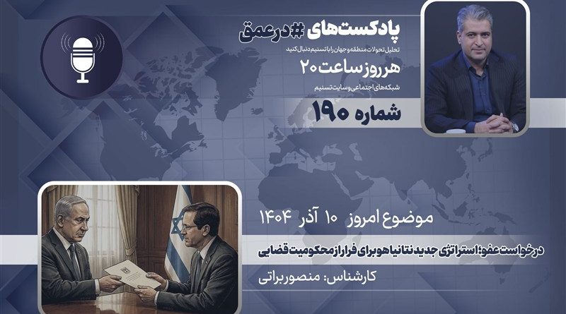گروه بینالملل خبرگزاری تسنیم ـ یکصدونودمین شماره از پادکست «در عمق» که به بررسی مهمترین روندها، تحولات و همچنین شخصیتها در غرب آسیا میپردازد، روز دوشنبه 10 آذر 1404 ضبط و منتشر شد. در این پادکست «منصور براتی»، کارشناس مسائل اسرائیل، درخواست رسمی بنیامین نتانیاهو، نخست وزیر رژیم صهیونیستی برای دریافت عفو در پروندههای قدیمی قضایی و پیامدهای آن را بررسی میکند.