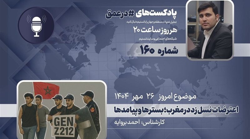 گروه بین‌الملل خبرگزاری تسنیم ـ یکصدوشصتمین شماره از پادکست «در عمق» که به بررسی مهم‌ترین روندها، تحولات و همچنین شخصیت‌ها در غرب آسیا می‌پردازد، روز شنبه 26 مهر 1404 ضبط و منتشر شد. در این اپیزود «احمد بروایه»، کارشناس مسائل مصر و شمال آفریقا اعتراضات نسل Z در مغرب را مورد بررسی قرار می‌دهد.